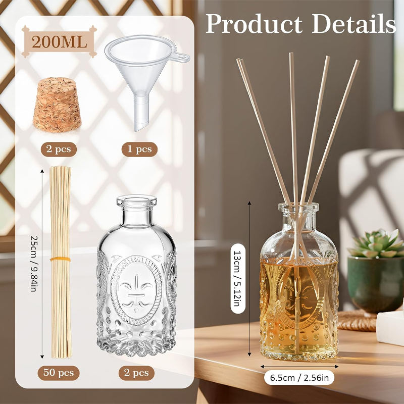 • Package includes: You will receive 2 glass diffuser bottles, 50 rattan reeds, 2 cork stoppers, and 1 funnel; each bottle comes with a corresponding cork stopper to seal the bottle and add a stylish and elegant touch to any space.