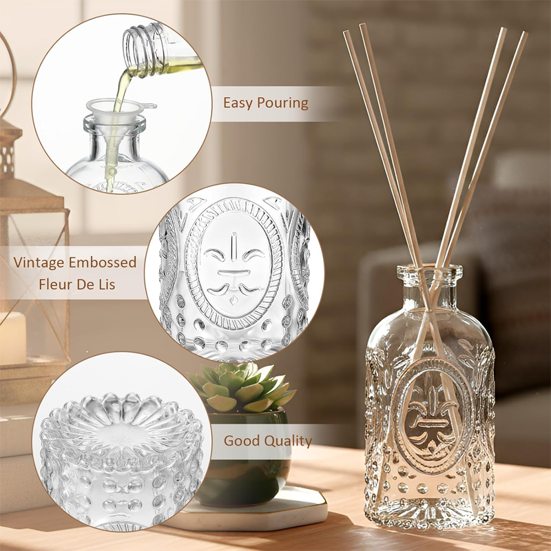 2-Piece Set Glass Reed Diffuser Bottles, Vintage Design Embossed Floral Transparent Diffuser Bottles with 50 Reeds