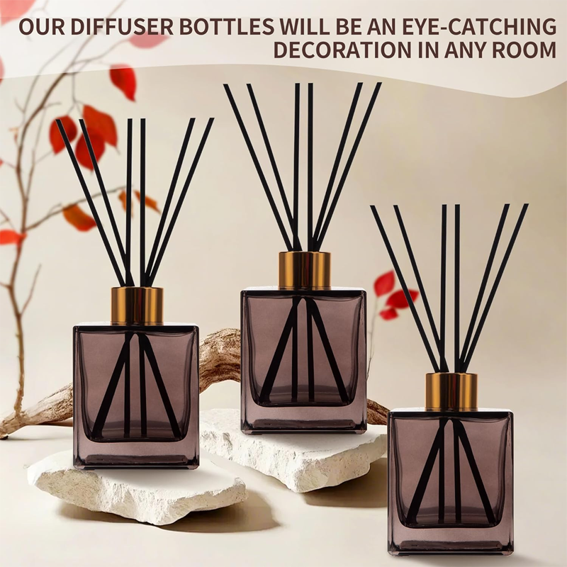 - Each set includes: 6 brown square glass diffuser bottles (with gold caps) and 36 black diffuser sticks.