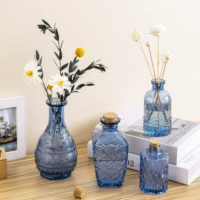 Each blue glass vase features a different textured pattern, shape, and size, making them small and exquisite, perfect for displaying on any desk, dining table, countertop, shelf, or mantelpiece.